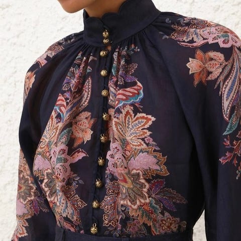 Rhiannon Billow Blouse fra Zimmermann er en elegant og iøynefallende bluse laget av et pustende naturmateriale perfekt for varmere dager. Blusen har lange, voluminøse ermer som samles inn med elastiske mansjetter for en feminin silhuett. Fronten lukkes med dekorative gullknapper festet med rouleau-løkker, og blusen er prydet med et dramatisk paisleymønster i nøye plassert print over hele plagget. Den romantiske blusen har en bølgete, brodert kant rundt kragen som gir et raffinert uttrykk.