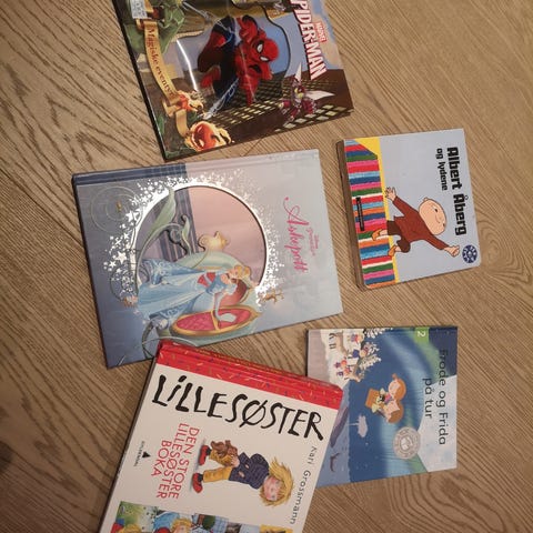En samling barnebøker med ulike titler og temaer. Bøkene varierer i størrelse og innhold, og passer for barn. Inkluderer både illustrerte historier og tekstbaserte bøker.
