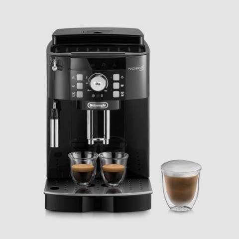 DeLonghi Dinamica Plus i svart farge. Maskinen har et moderne design og flere funksjoner for å lage kaffe, cappuccino, espresso og anna. Den passer for hjemmebruk og har en kompakt størrelse som gjør den enkel å plassere på kjøkkenbenken. Med egen melkeskummer å kan også få berre varmt vatn til f. eks te eller nudler.