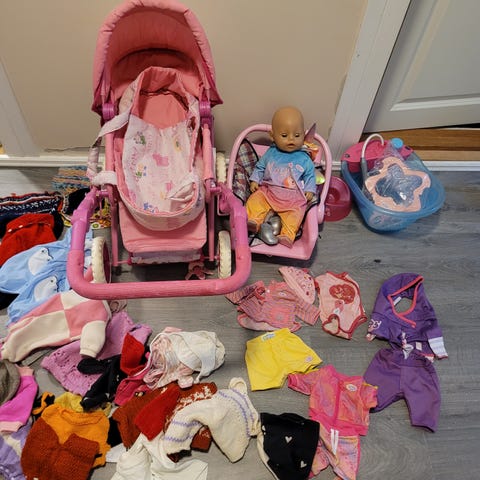 Helt nye dukkeklær (1 kjole og et sett med bukse) til 43 cm Baby born dukke. Liten klespakke. Uten lapp. Selges samlet.