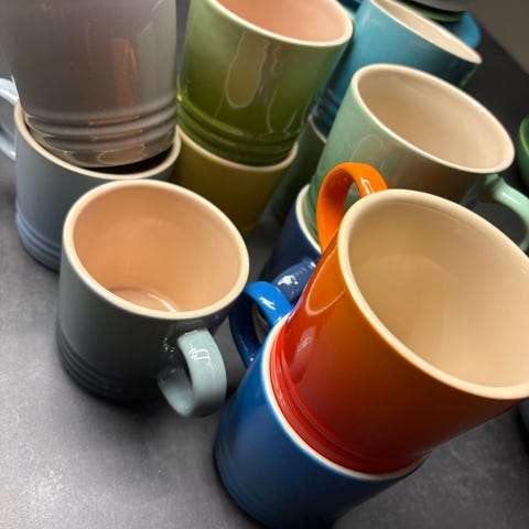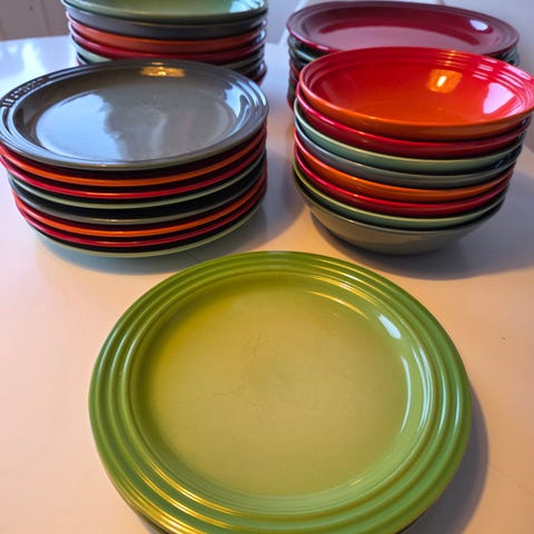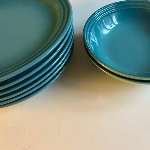 Le Creuset kjøkkenutstyr og servise i forskjellige farger og størrelser. Inkluderer kopper, skåler og fat. Kan selges seperat eller hele samlet. Selges rimelig. Pris er veiledende. Hentes på Levanger.