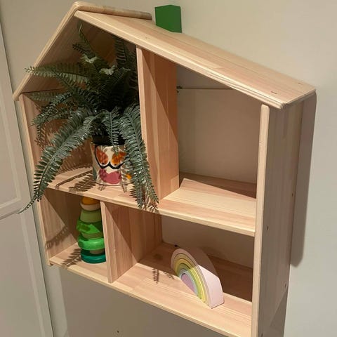 IKEA hylle form av et dukkehus laget i tre. Dukkehuset har flere rom og hyller som kan brukes til oppbevaring eller lek. Passer til barn for lek og organisering av småting.