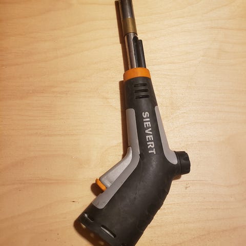 Sievert Propanbrenner med gassbeholder. Brenneren har et håndtak med avtrekker og en tilkoblet blå gassbeholder. Egnet for oppgaver som krever propanbrenner, for eksempel oppvarming og lodding.