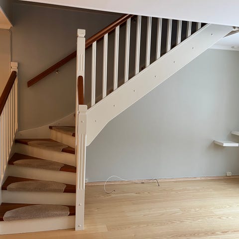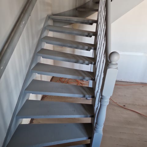 Tretrapp med hvitmalte rekkverk og mørke trinn - GI BUD.