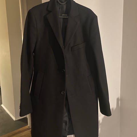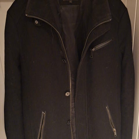 J. Lindeberg kåpe i svart farge, laget av ullmateriale. Kåpen er i størrelse 50 og er designet for menn. Modell Artie Melton Coat