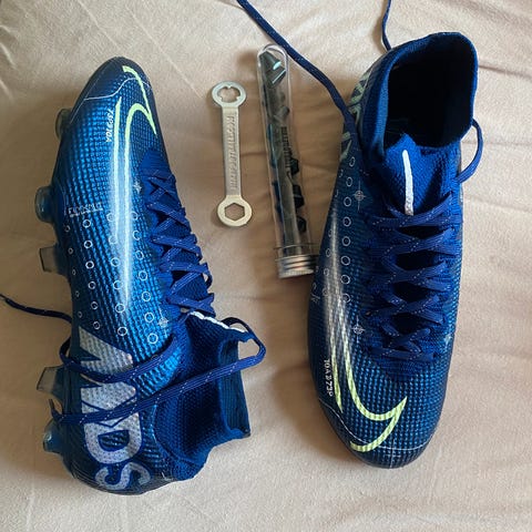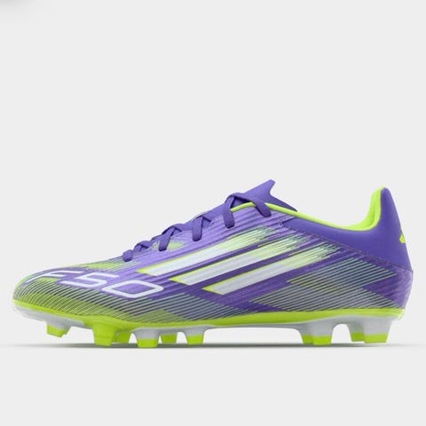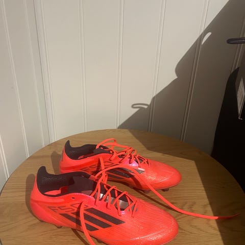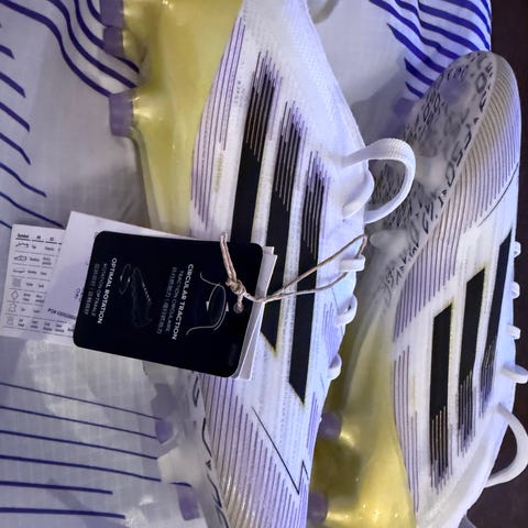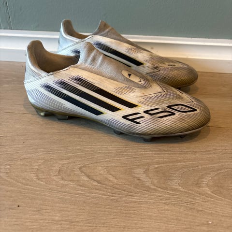 Adidas F50 fotballsko i hvit farge med blå og røde detaljer. Skoene har knotter på sålen for bruk på gressbaner. Designet for fotballspillere, med snøring og lav ankelhøyde. str39