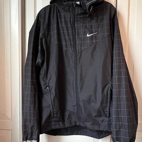 Nike løpejakke for herre i størrelse S, blå farge. Jakken er designet for løping og har en lett og pustende konstruksjon.