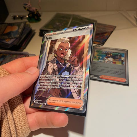 Pokemon Tulip Trainer kort med holografisk design. Kortet er en del av Pokemon Trading Card Game og brukes til spill og samling.