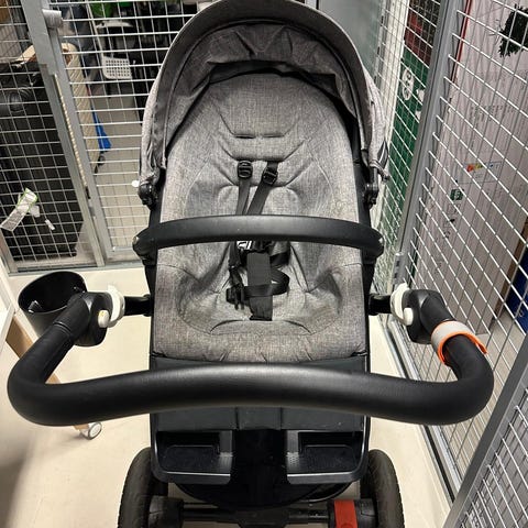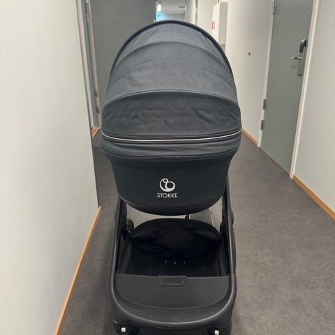 Stokke barnevogn i svart farge med justerbart sete og solskjerm. Utstyrt med fire hjul og komfortabelt håndtak. Passer for barn og gir god støtte og sikkerhet under bruk. Følger oss med en paraply til vognen. Har også en regnovertrekk og babysete til bilen. Selger bilig på grunn av at en av hjulene trengs å bytte. Koster cirka 300kr å bytte.