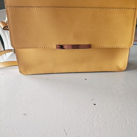 Even&Odd skulderveske for dame laget av lær. Vesken har en rektangulær form med klaff og en metallspenne på fronten. Den har en justerbar skulderrem med kjededetaljer. Innvendig rom med glidelåslomme og stofffôr.