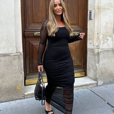 Kjempeflott strikket maxikjole fra NA-KD, lilla/mørk lilla mot grå, sølvglitter.
