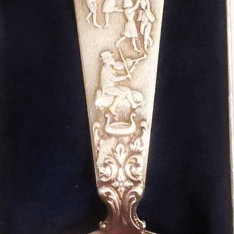 På en skje står det "Reine". Skjeene har vikingmotiv og scener fra tradisjonelt norsk seterliv, perfekt for samlere eller som dekorative minner.