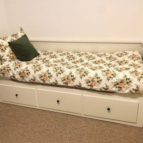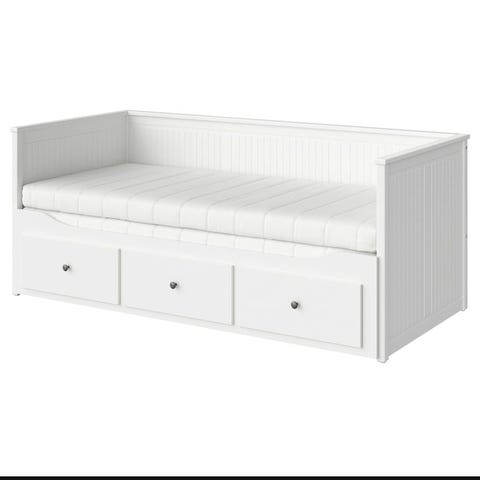 Selger en brukt Hemnes dagseng. Har blitt brukt som gjesteseng. Det mangler en planke som du ser på bildet.