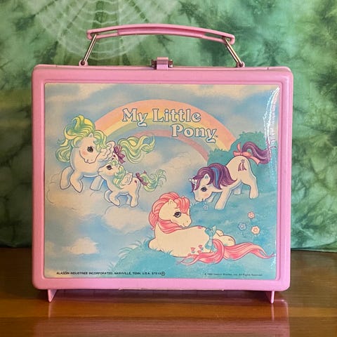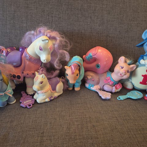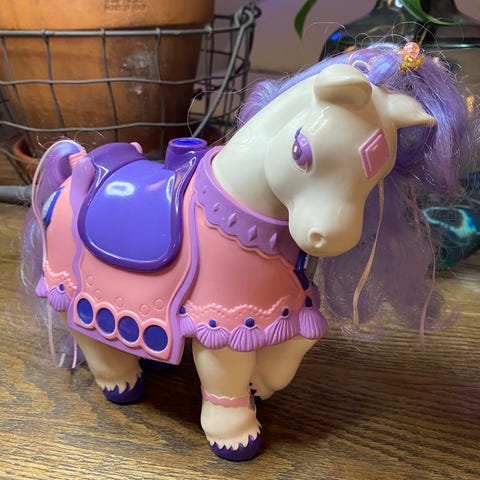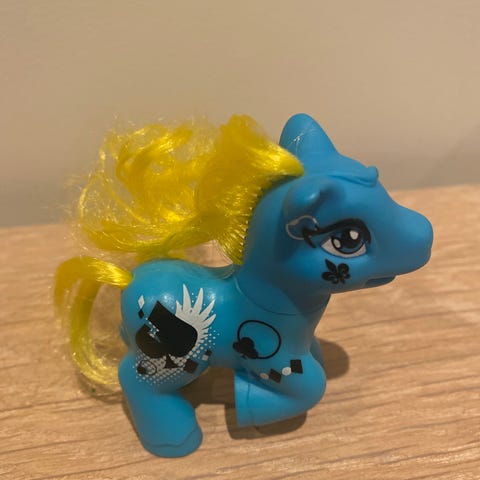 My Little Pony Lekeleke hest i lilla plastmateriale med blå man og hale. Figuren har detaljer som store øyne og blå hover. Passer til lek og samling.