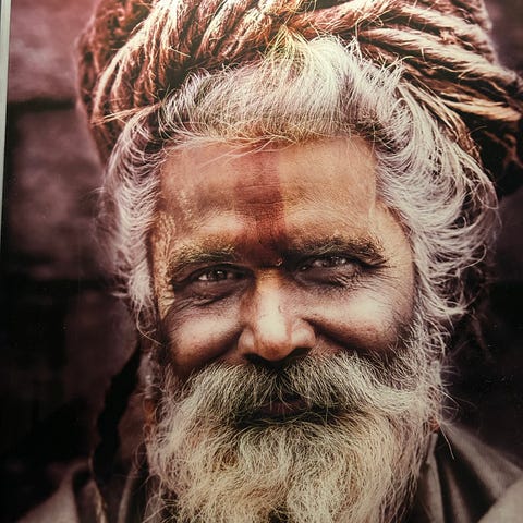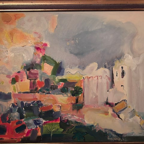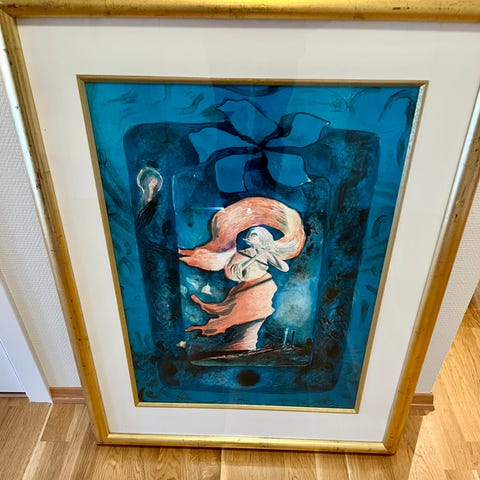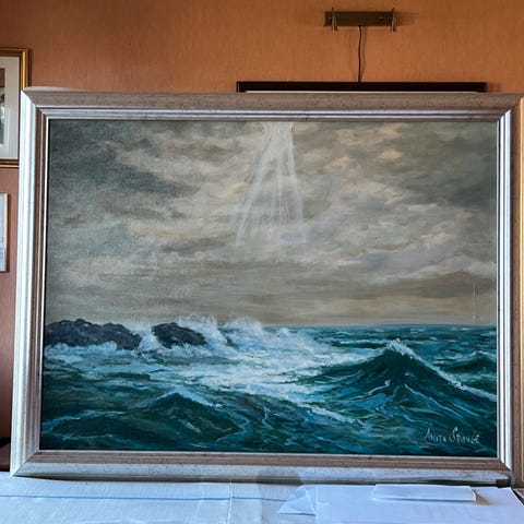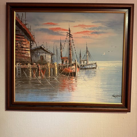 Omar oljemaleri med motiv av båter ved kai i solnedgang. Maleriet har varme farger og er innrammet i en mørk ramme.