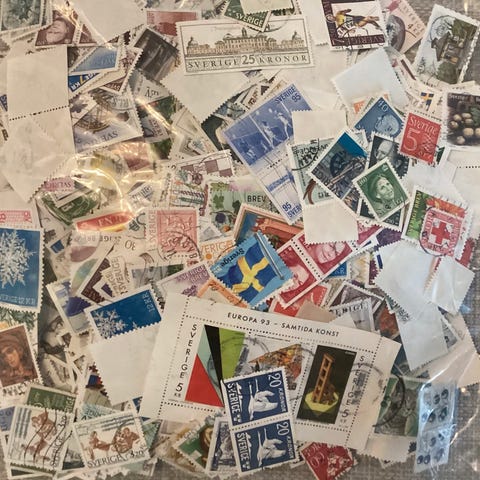 Brett med verdifulle gamle frimerker. Gi bud.