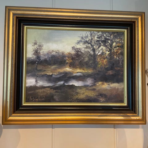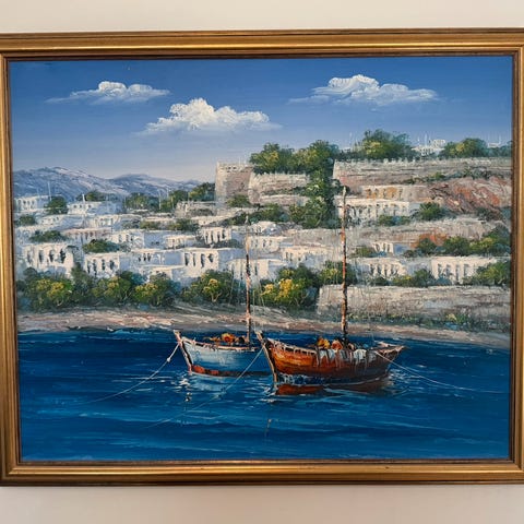 Signert maleri som forestiller en scene fra Venezia med en bro over en kanal og en gondol. Maleriet har en ramme og viser bygninger i varme farger. Passer til dekorasjon av vegg.