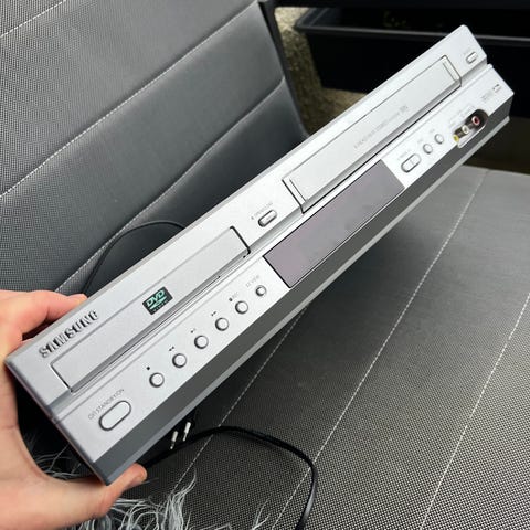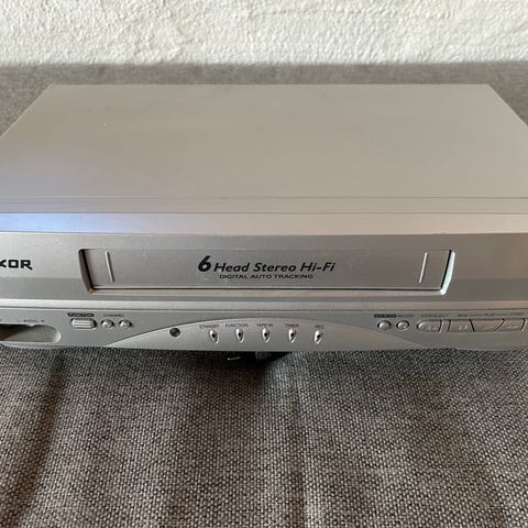 Panasonic NV-HV65EC-S VHS-spiller i sølvfarge. Enhet for avspilling av VHS-kassetter med standard tilkoblinger. Strømforsyning 220-240V, 50/60Hz, 18W. Laget i Europa.