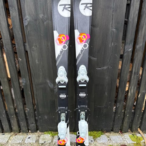 Bindinger følger med og sitter på skiene. Skiene er ikke nylig slipt eller vokset, så de vil ha godt av en enkel service før aktiv bruk.