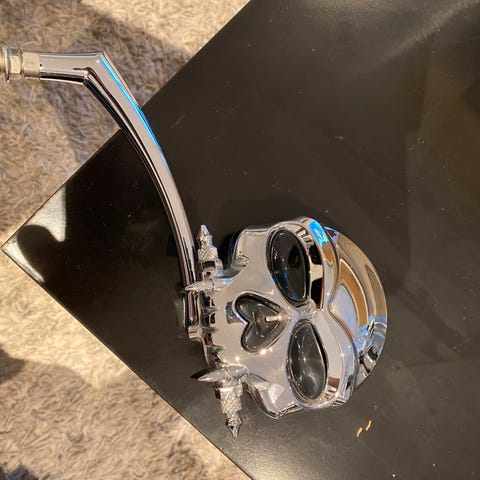 Motorsykkel speil sett med runde speil og svart metallramme. Speilene har feste for montering på styret og leveres i et sett med to stk. Egnet for bruk på motorsykler for økt sikt bakover.