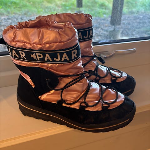 Pent brukte Pajar vinterstøvler i rosa og svart for barn. Støvlene har snøring foran for enkel justering. Sålen har godt grep for vinterbruk. Egnet for kalde og snørike forhold.