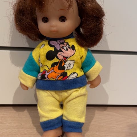 Monchhichi dukke kledd i rød og hvit stripete genser, blå bukser, og inkluderer en stråhatt med rød dekorasjon. Dukken har myk pels og hale, og er ca. 20 cm høy. Passer som samleobjekt eller leke.