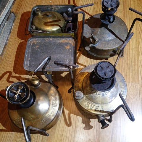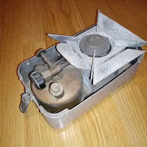 Cooker Portable No.2 og 3 bærbar kokeapparat med integrerte verktøy, inkludert skiftenøkkel og tang, i metallkasse. Designet for bærbar bruk med instruksjoner festet innvendig på lokket.Ser ut til å mangle en type rist.