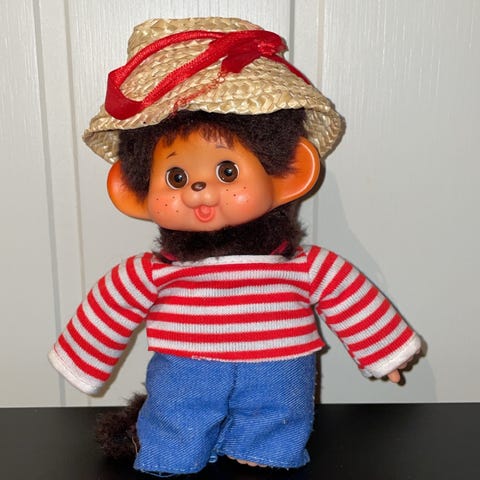 Monchhichi klovn dukke med blå og gul kosedrakt. Dukken er ca. 15 cm høy og har mykt hår. Passer som samlerobjekt eller leke.
