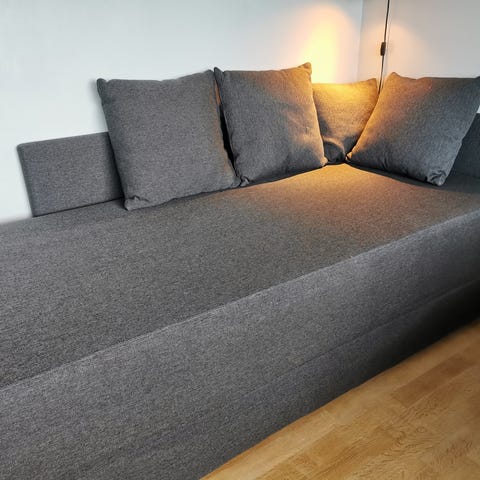 Pen Hovden sovesofa med grått ullstoff selges. Sofaen er er lite brukt og har stått på gjesterom, i røykfritt hus uten dyr. Den er kjøpt på sovesofaspesialisten, og nypris i dag ligger rundt 20 000. Må hentes.