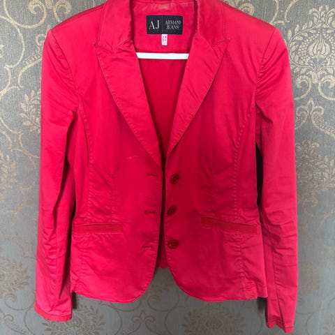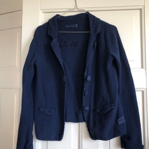 Pen jakke i en ull blanding (klipt av lappen og glemt hva blandingen var) Fargen blå-svart. Klassisk dressjakke fasong. Varm og god. Tynn sølv lenke rundt kanten.
