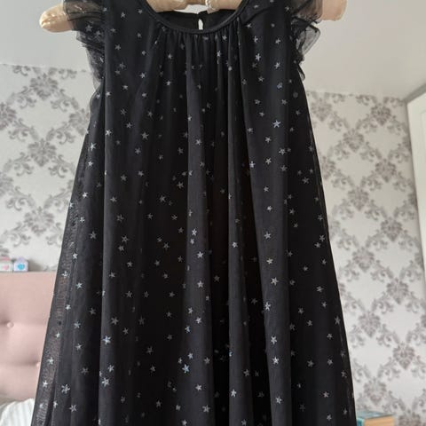 Lappen er klippet av, men kjolen er str. 134, fra HM 😊 Ingen flekker eller andre anmerkninger som jeg kan se 😊