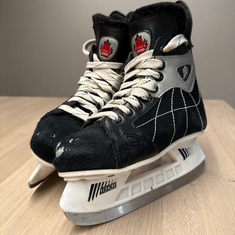 Canada Ishockey Skøyter for barn i størrelse 33. Skøytene er designet for ishockey og er svarte og grå. Ikke noe rust. Slipte og klare for isen.