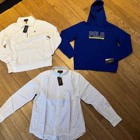 Tre klassiske, originale RL klær for gutt; hvit og lyseblå «the Iconic Oxford shirt» str M, samt rød piquet- trøye, også str M. Kjøpt nytt i 2025 og aldri vært brukt; merkelappene henger fortsatt på.