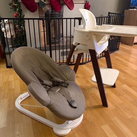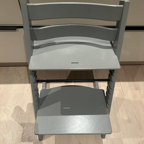 Stokke høy barnestol i tre med justerbar sitte- og fotplate. Designet for barn, gir støtte og komfort under måltider. Har avtagbart brett for enkel rengjøring og sikkerhetsbelte for trygg bruk. Følger også med lik pute til sete.