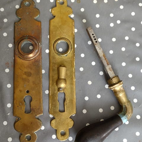 Gammelt låsesystem med tilhørende nøkkel. Låsen er laget i metall og har et rustikt utseende. Passer til bruk i eldre dører eller som dekorativt element.kan sendes kom med bud