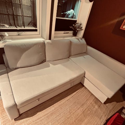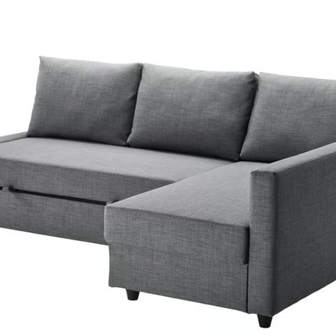 Selger min IKEA Friheten sovesofa i fargen beige. Dette er en utrolig praktisk sofa som enkelt gjøres om til dobbeltseng, og den har romslig oppbevaring under sjeselongen til f.eks. sengetøy. Sjeselongen kan monteres på valgfri side.