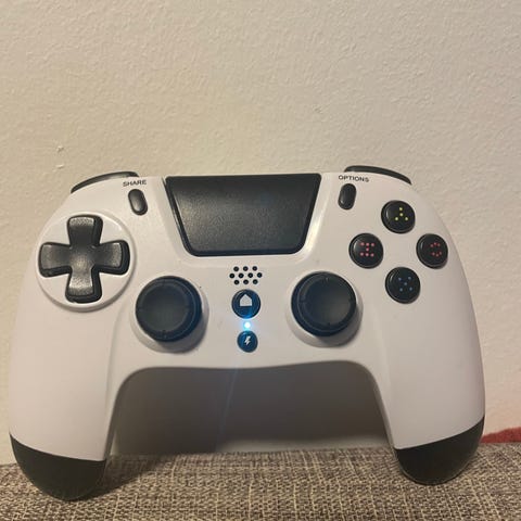 Sony DualShock 4 trådløs kontroller i svart farge. Passer for PlayStation-konsoller. Har standard knappoppsett med analoge spaker, D-pad og berøringsflate.