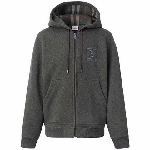Genseren er brukt noen få ganger og er renset. Ingen flekker eller skader, og glidelåsen fungerer perfekt. Brodert Burberry‑logo på venstre erme og rødt innerfôr i hetten.