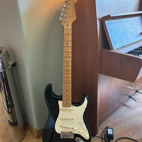 Nye Daddario 010 strenger. Sadel filt for lav action til første bånd ei tid tilbake. Intonert og ferdig satt opp med polerte bånd. Lett å spille på. Tremolo satt opp flytende og ingen slark merkes i armen. Kvalitets-tremolo med tykk blokk.