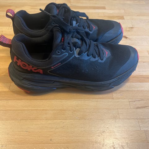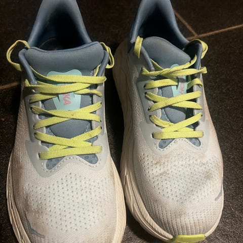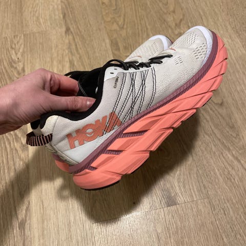 Hoka løpesko i størrelse 40 2/3. Skoene er designet for løping og har en slitesterk såle med godt grep. Fargen er en kombinasjon av oransje og beige toner. Materialet er lett og pustende, egnet for trening og løpeaktiviteter.