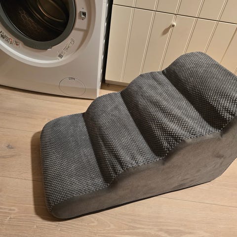 Hundetrapp til sofa eller lignende i mykt, plysjstoff (avtagbart) med antiskli. Stått ubrukt lenge nok nå. For mål se bildene. Må hentes på Husbymyra, Stjørdal, Trøndelag.