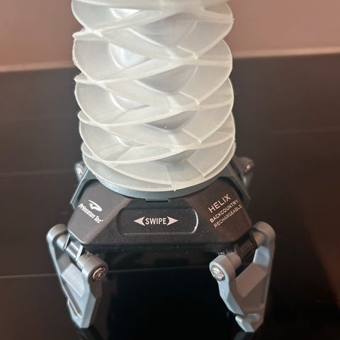 Håndtaket er organisk og naturlig, som det meste av det utvendige. Endeved og underside er formet. Den står fint på bord og er fin på tur.