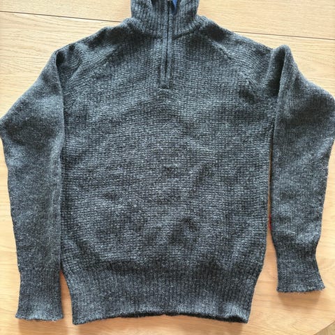 Kjempefin hjemmestrikket Marius genser i str 8- 10 år selges. I fargen mørkegrå, mønster i hvitt og lyseblått.