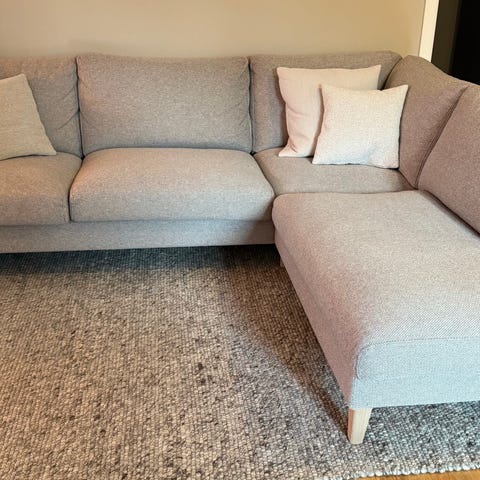 Stor, behagelig og pent brukt hjørnesofa 4-seter med sjeselong. Er nylig vasket, men har litt preg av daglig bruk i 4 år. Likevel er kvaliteten så god, at den har myye bruk igjen ☺️ Ny pris 24.999,-