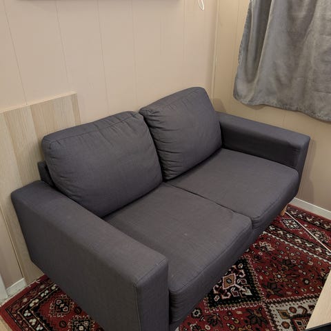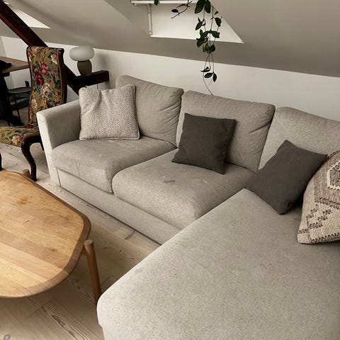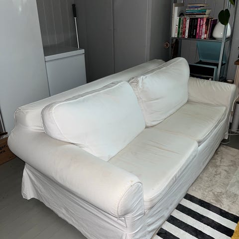 Sofaen er brukt, og trekkene på putene kan være litt slitt. Det er mulig å kjøpe nye trekk hos IKEA.