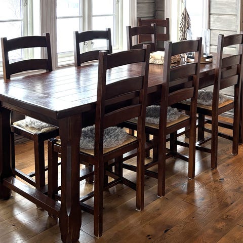 Fin spisegruppe i furu. Selges med 6 stoler og 2 klaffer. Klaffene er 40 cm hver. Border blir 250 cm langt med begge klaffene.