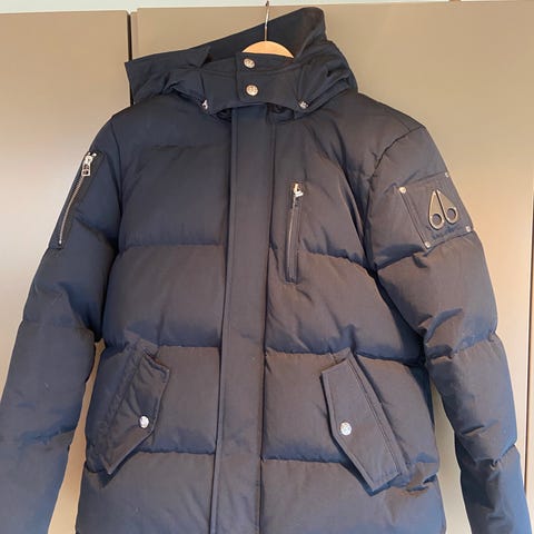 Moose Knuckles jakke i svart med fuskepels, størrelse 168-173 beregnet for barn og unisex.