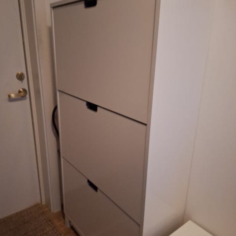 2 hvite stenger til å løfte skoene opp med i skoskapet sånn at man får bedre plass.