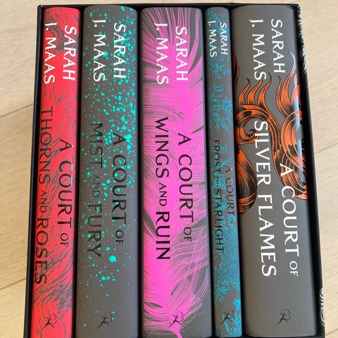 Sarah J. Maas 'A Court of Thorns and Roses' (ACOTAR) bokserien i engelsk hardback. Består av A Court of Thorns and Roses, A Court of Mist and Fury, A Court of Wings and Ruin, A Court of Frost and Starlight og A Court of Silver Flames. Fremstår som ny!