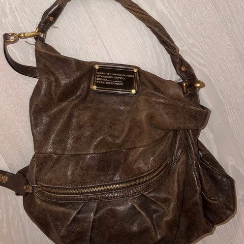 Marc Jacobs dame veske laget i saffiano skin. Vesken har en rektangulær form med glidelås på toppen og dekorative gullfargede detaljer. Den har en bred, justerbar skulderrem med mønster i svart og hvitt. Egnet for daglig bruk og finere anledninger.